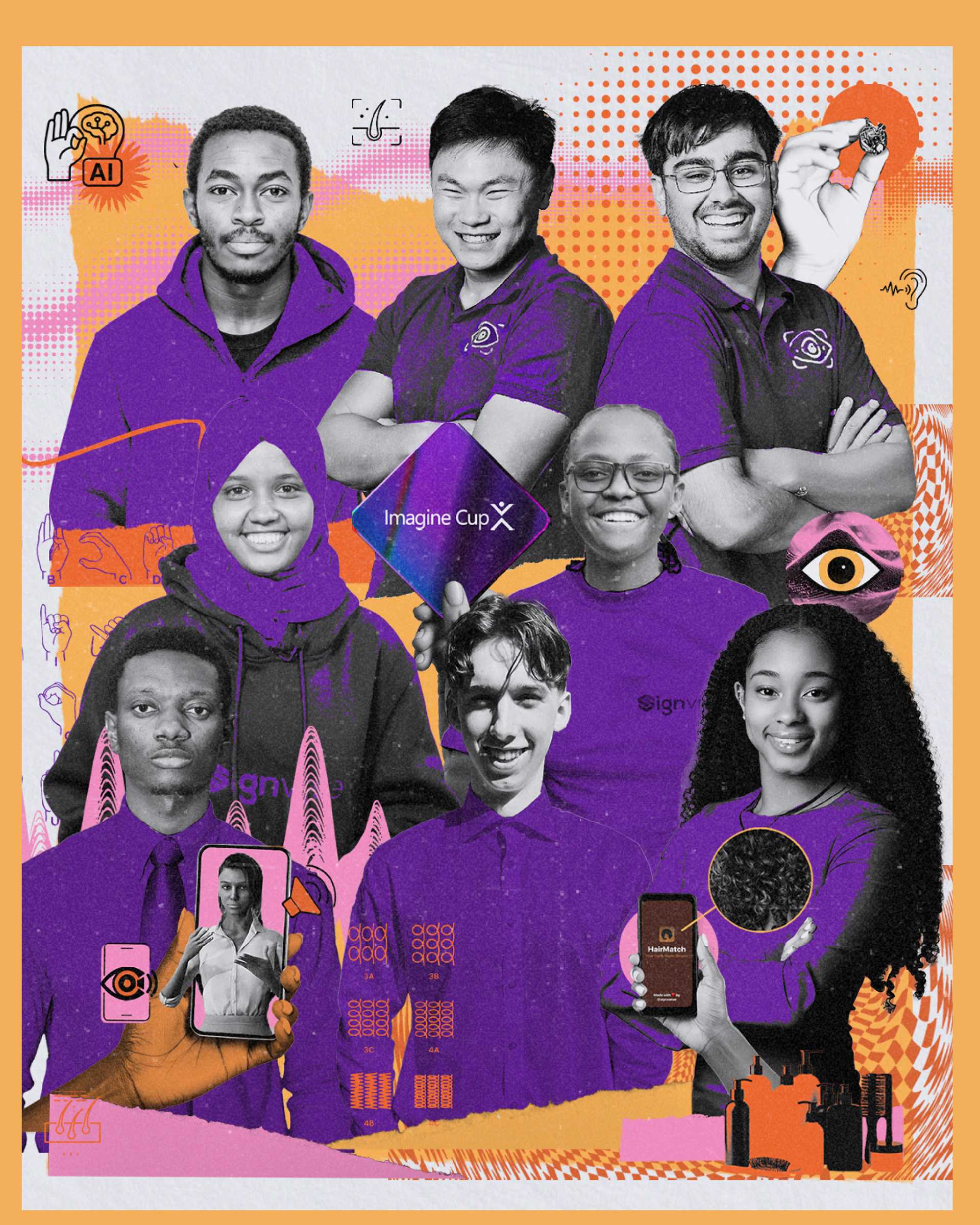 Este encargo tuvo como objetivo destacar el talento, la creatividad y la pasión de jóvenes estudiantes que están utilizando la inteligencia artificial para transformar comunidades y mejorar vidas, no solo en América Latina sino en todo el mundo. Busqué reflejar en cada pieza el espíritu disruptivo y la energía de estas nuevas generaciones que están reconfigurando el presente y proyectando un futuro más inclusivo y tecnológico.