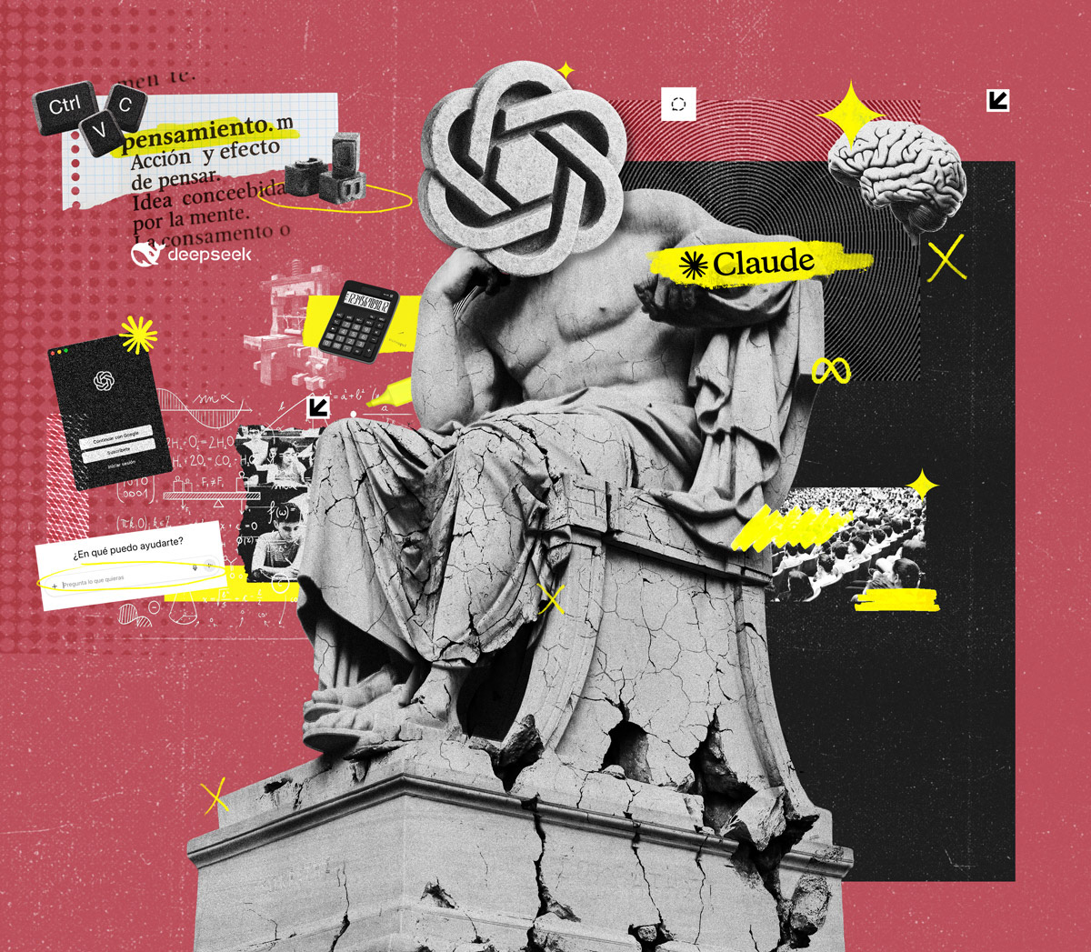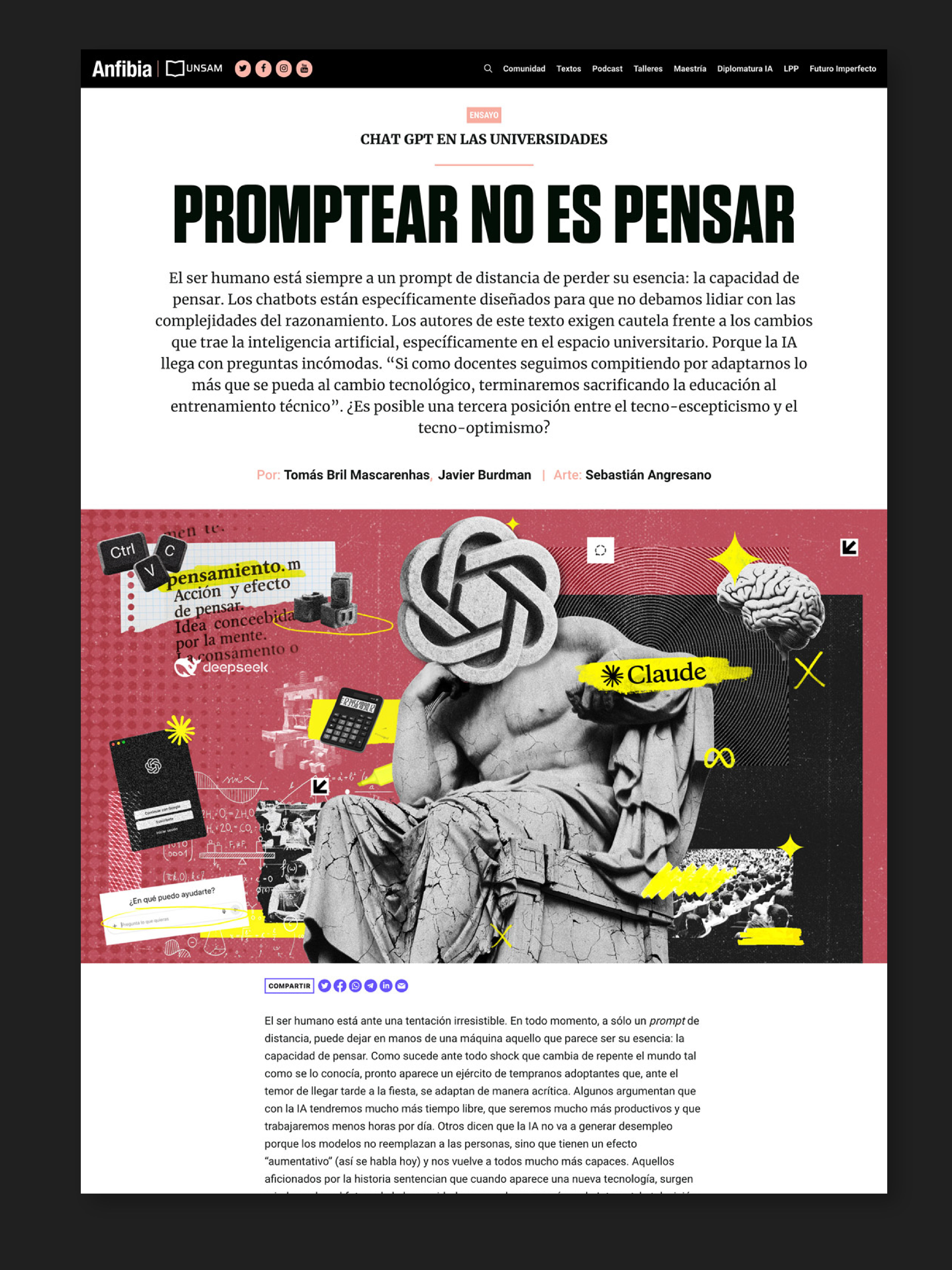 Realice la portada para la nota de Tomás Bril Mascarenhas + Javier Burdman publicado en Revista Anfibia. - Un texto donde se reflexiona sobre el uso de las herramientas de IA en la universidad. Y que creo que también nos invita a pensar sobre el impacto de la inteligencia artificial en los ámbitos laborables, profesionales y personales.